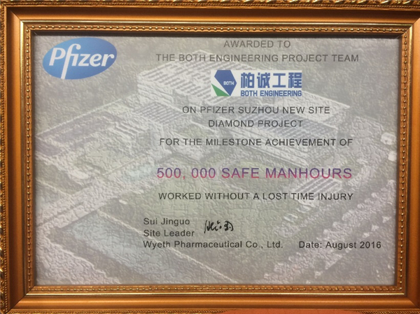 2016年8月,公司苏州辉瑞项目部在近期现场安全工作中表现突出,业主特颁发“50万工时安全无事故奖”以示表彰。